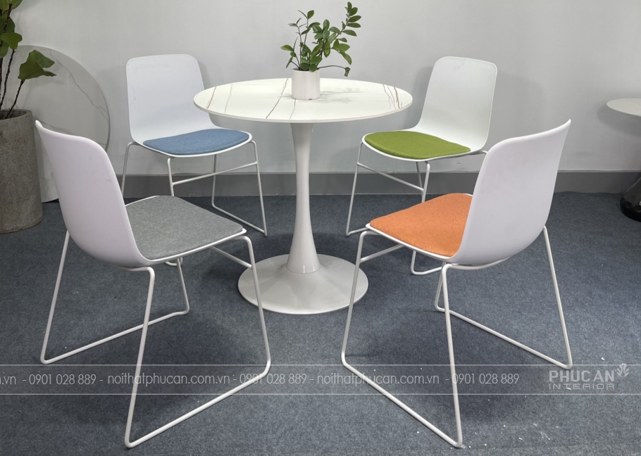4 ghế được chế tạo từ nhựa PP đúc có kết cấu vững chắc, dẻo dai kết hợp với phần nệm ngồi bọc vải bố êm ái, bền chắc; Ngoài ra, phần chân ghế thép sơn tĩnh điện chống được các hiện tượng rỉ sét, gãy, cong mang đến độ bền, sự hiện đại sang trọng cho khu vực tiếp khách của khách hàng.